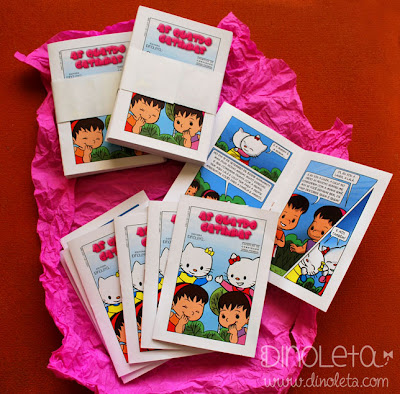 A cliente chegou com a ideia de história em quadrinhos para o aniversário de 1 ano das gêmeas Laura e Luiza. O tema da festa também já estava decidido: Hello Kitty.